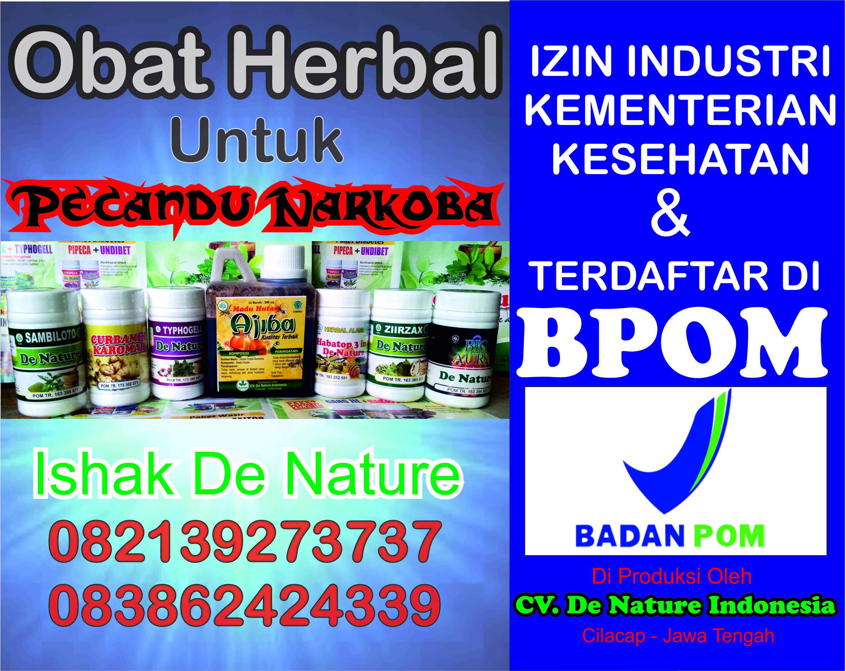 Kami De Nature Indonesia menjual Obat Untuk Pecandu Narkoba yang bisa mengurangi kecanduan narkoba dan bisa memperbaiki sel saraf saraf yang telah rusak akibat bahan kimia yang terkndung dalam Narkoba.